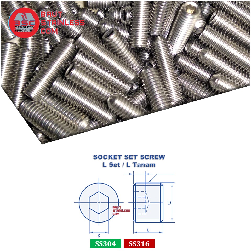 Socket Set Screw, L set or commonly called L Planting is a threaded round rod whose head is the same diameter as the body. in the middle of the head is made indented in the shape of a hexagon which functions for tightening. Tightening is done with a hexagonal axle iron key which is bent into an L shape. L Planting is usually used to lock round rods with their housings so they don’t rotate or come loose.